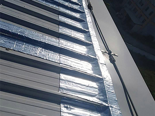轻钢厂房屋脊、彩钢板、采光板之间搭接、落水天沟等连接处防水,门窗框与墙体、混凝土屋面、通风管道等连接处防水。撕掉胶带表面的离型纸,沿接缝处或裂缝处贴上胶带,用手或小压辊去碾压铝箔(无纺布、PE 等)胶带表面,使之与被粘物表面充分紧密粘贴。